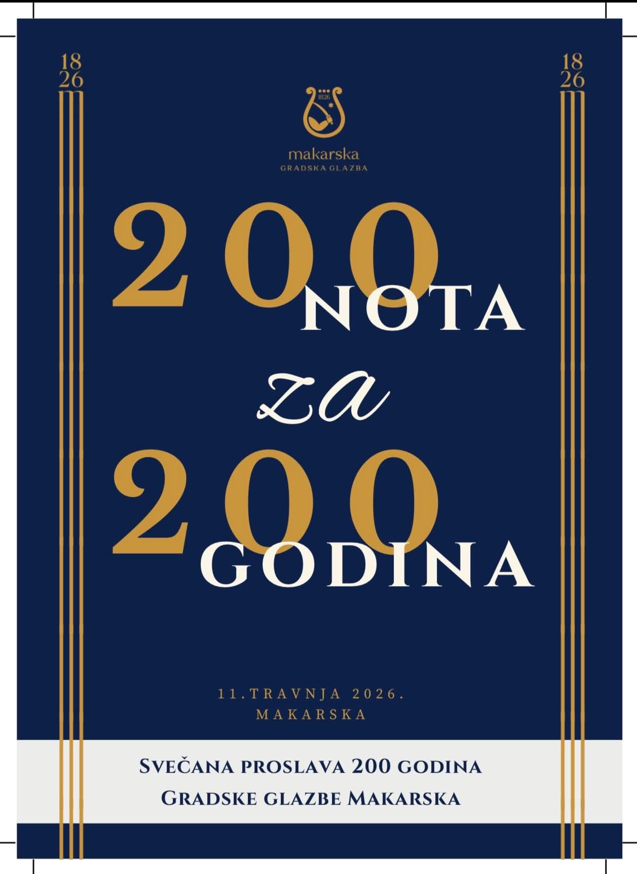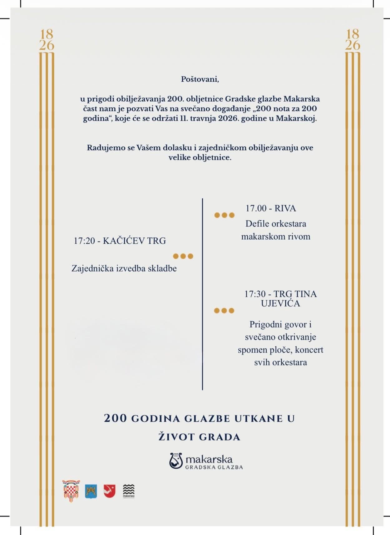 Program obilježavanja dva stoljeća Gradske glazbe Makarska, pod nazivom “Zvuk. Tradicija. Generacije” protegnut će se na čitavu 2026.godinu, kroz niz glazbenih događanja u gradu: 30.svibnja u planu je središnja točka proslave, veliki koncert uz brojne glazbene goste, koji će se održati na pozornici Kačićevog trga.
