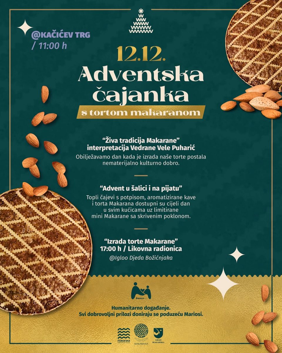 Organizatori makarskog Adventa pozivaju na Adventsku čajanku s tortom makaranom, koja će se održati u petak 12. prosinca na Kačićevom trgu, s početkom u 11 sati.