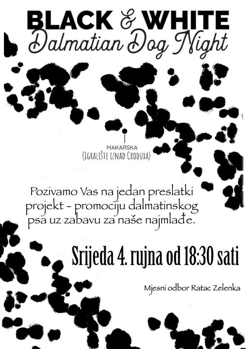 Mjesni odbor Ratac Zelenka najavio je događaj pod nazivom “Black & White Dalmatian Dog na Zelenci,” koji će se održati u srijedu, 4. rujna, s početkom u 18:30 sati. Lokacija događaja je dječje igralište iznad Croduxa, gdje će djeca imati priliku sudjelovati u radionici posvećenoj dalmatinskom psu.