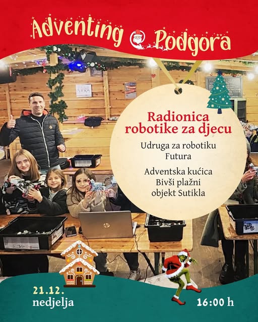 Danas, u 16 sati, u Podgori u adventskoj kućici bit će organizirana radionica robotike za djecu. Udruga za robotiku Futura održat će radionocu u bivšem plažnom objektu Sutikla, a ulatak u čudesni svijet robotike namijenjen je primarno djeci osnovnoškolske dobi.