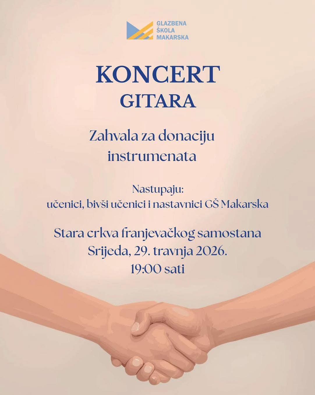 U prostoru Stare crkve franjevačkog samostana u Makarskoj, u srijedu 29.travnja održat će se koncert učenika, bivših učenika i nastavnika gitare u Glazbenoj školi Makarska.