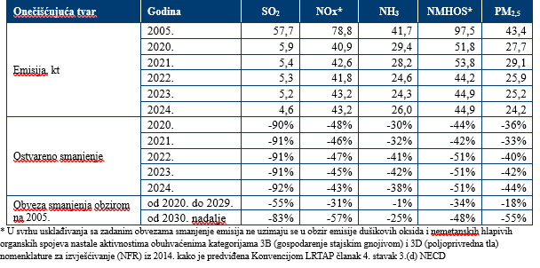 Emisije amonijaka (NH₃) u 2024. godini iznosile su 26,0 kilotona, što je 38 % manje nego 2005. godine. Više od 90 % emisija potječe iz poljoprivrede, osobito iz uzgoja stoke, gospodarenja stajskim gnojem i primjene mineralnih gnojiva. Iako je Hrvatska trenutačno usklađena s obvezama za razdoblje 2020.–2029., obveza smanjenja od 25 % od 2030. godine nadalje zahtijevat će dodatne napore. Daljnje smanjenje NH₃ tehnički je i strukturno zahtjevno jer ovisi o investicijama u modernije sustave skladištenja i primjene gnojiva te o promjenama u poljoprivrednim praksama. Zbog toga se poljoprivreda smatra jednim od sektora s najvećim rizikom u kontekstu budućih ciljeva.