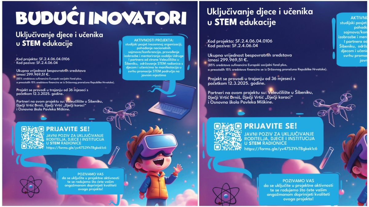 Ovi putem pozivamo roditelje i skrbnike da uključite Vašu djecu u radionice iz područja STEM-a kako bi Vaša djeca s nama uronila u svijet eksperimenata, pokusa i znanosti te počela svoj put mladih inovatora! Projektne aktivnosti za Vašu djecu su u potpunosti besplatne, a sam projekt je financiran sredstvima Iz Europske Unije kao I proračuna Vlade Republike Hrvatske.