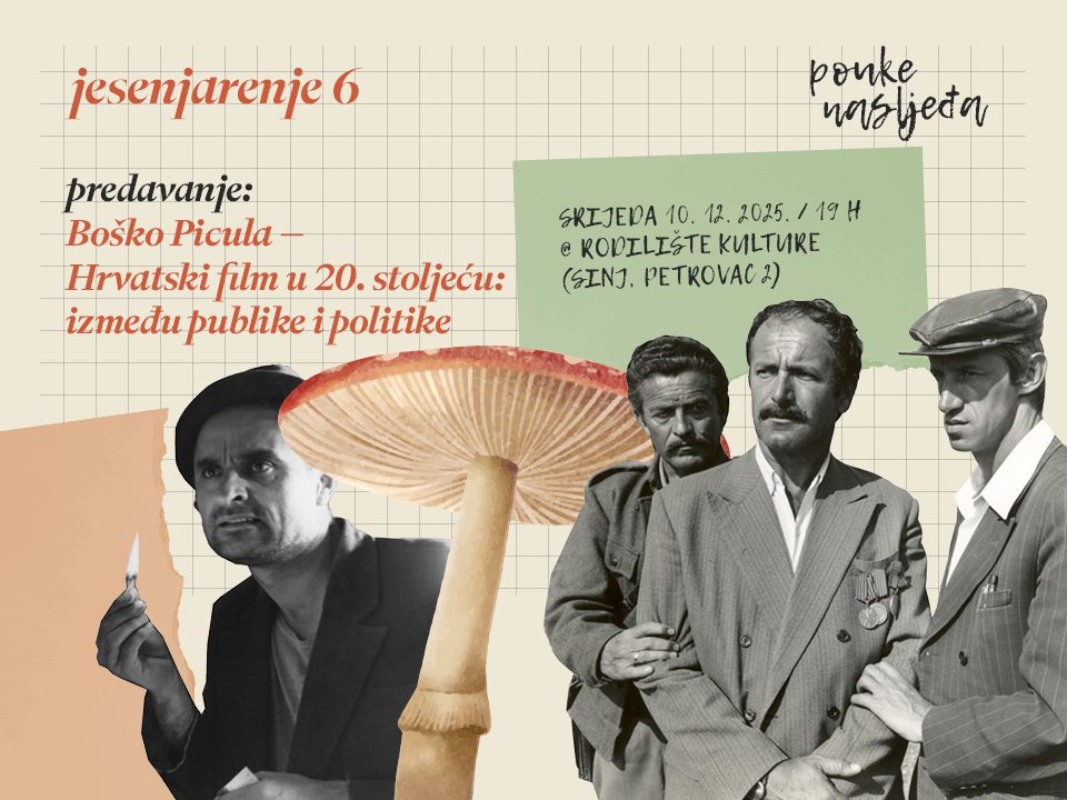 U srijedu 10. prosinca s početkom u 19 sati u sklopu ovogodišnjeg programa udruge Sinjski kulturni urbani pokret (SKUP) – Jesenjarenje 6: Pouke nasljeđa, održat će se predavanje dr. sc. Boška Picule na temu Hrvatski film u 20. stoljeću: između publike i politike. Predavanje će se održati u sinjskom Rodilištu kulture (Petrovac 2).