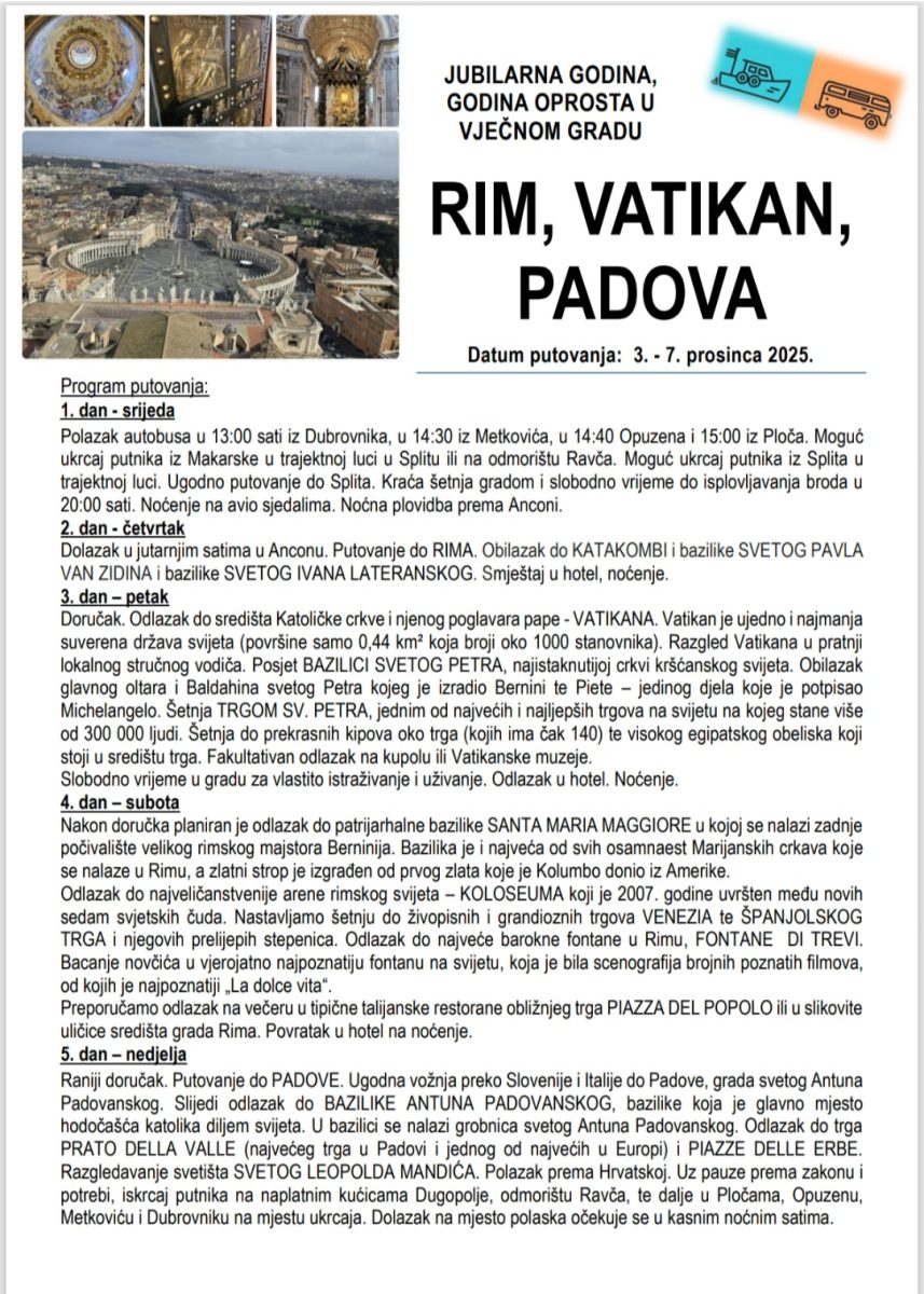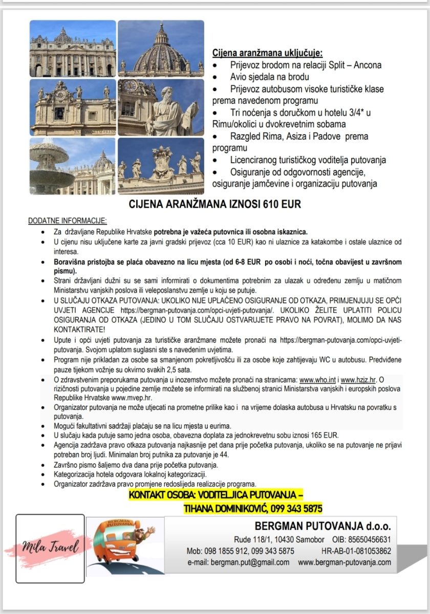 Sudionici putovanja imat će u tih nekoliko dana priliku posjetiti neke od najvećih vjerskih, kulturnih i povijesnih znamenitosti Italije – katakombi, bazilike svetog Pavla izvan zidina i bazilike svetog Ivana Lateranskog, razgledavanja Vatikana i posjet bazilici sv. Petra, obilazak patrijarhalne bazilike Santa Maria Maggiore, posjet Koloseumu, obilazak Španjolskog trga, Fontane di trevi, a završava u Padovi posjetima bazilici Antuna Padovanskog, razgledavanju svetišta Leopolda Mandića…