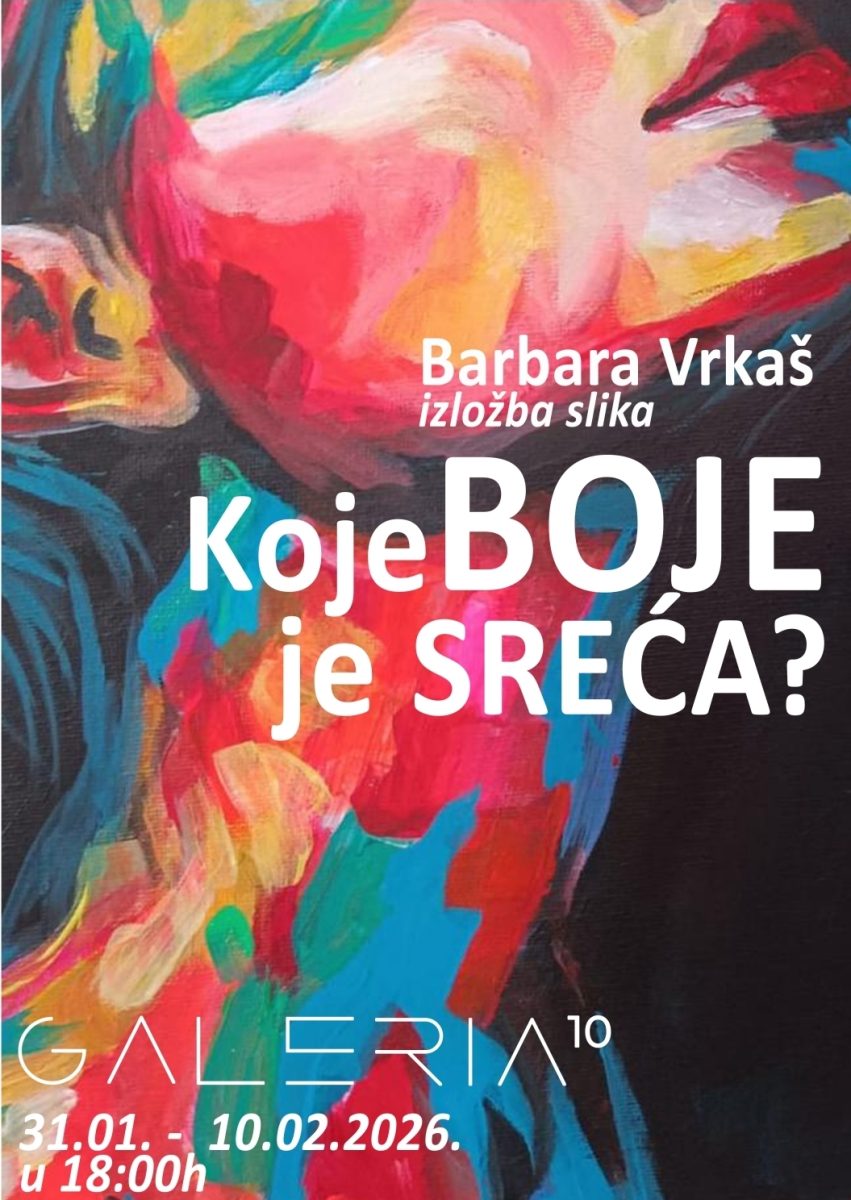 Iz Galerije 10 pozivaju na otvaranje izložbe likovnih radova pod nazivom “Koje boje je sreća?”, autorice Barbare Vrkaš, koje se održava u subotu 31.siječnja u 18 sati na adresi Kalalarga 10.