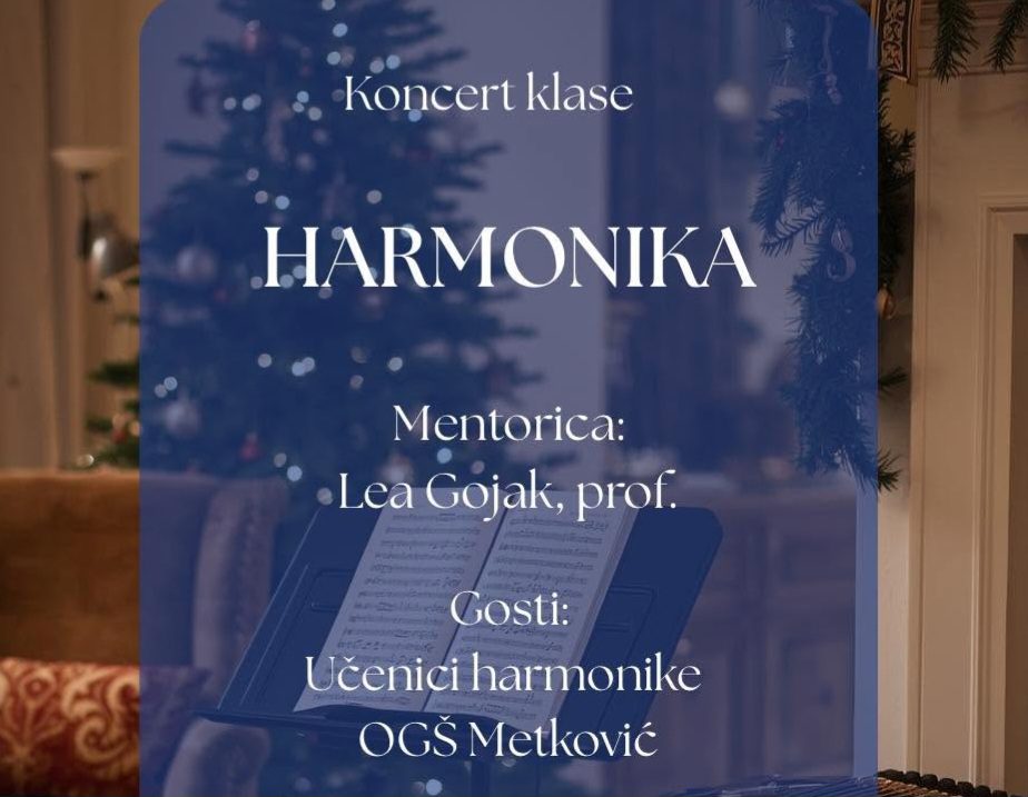 Tako će koncert klase harmonike pod mentorstvom prof. Lee Gojak biti održan u petak, 12. prosinca, s početkom u 17 sati u dvorani Arte.Kao gosti nastupit će učenici harmonike Osnovne glazbene škole Metković.