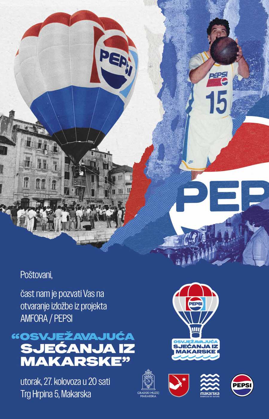 Pod nazivom “Osvježavajuća sjećanja iz Makarske,” ova izložba oživljava priču o kultnoj tvornici Amfora, koja je od 1967. godine pa sve do kraja 1990-ih punila milijune bočica Pepsi Cole i drugih osvježavajućih pića. Posljednji put u našem gradu, okupimo se zajedno u hladu uspomena pod originalnim Pepsi suncobranom i prisjetimo se zlatnih godina Pepsija u Makarskoj.