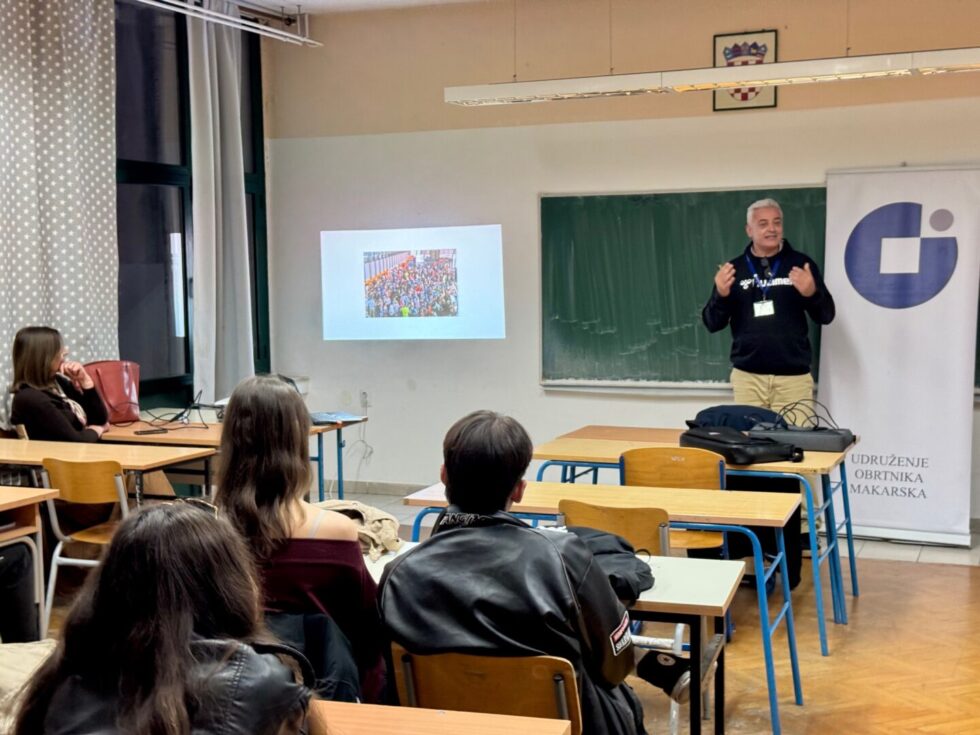 Za učenike 4.e razreda proteklog tjedna u Srednjoj školi fra Andrije Kačića Miošića održano je gostujuće predavanje koje su pripremili Sandra Talaja Rusendić, tajnica Udruženja obrtnika Makarska, i Dragan Begić, turistički vodič. Tajnica se prigodnim riječima obratila učenicima, nakon čega je turistički vodič predstavio svoje zanimanje i podijelio iskustvo stečeno tijekom dugogodišnjeg rada.
