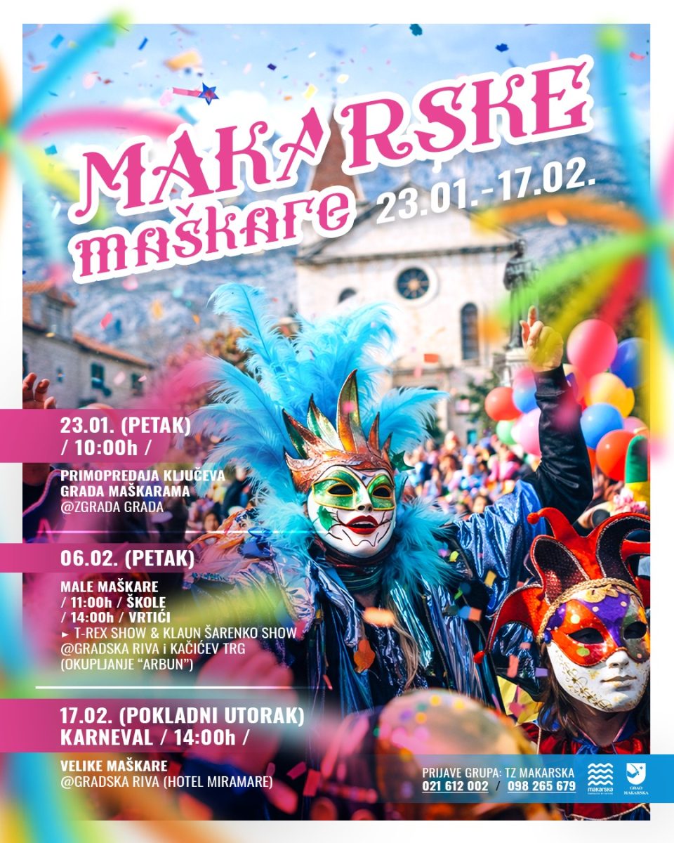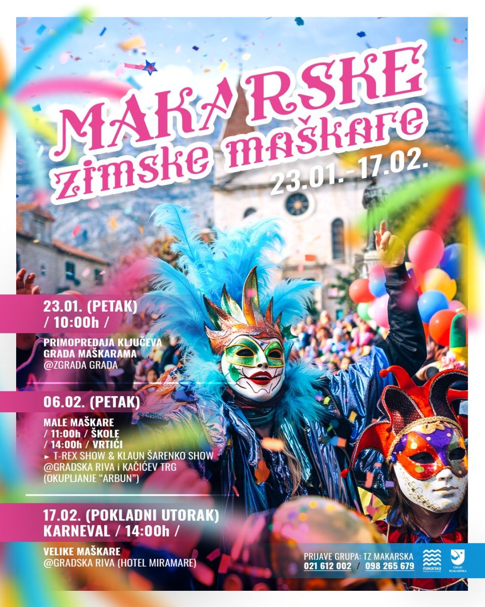 Grad Makarska i Turistička zajednica Grada Makarske pozivaju sugrađane i posjetitelje da budu dio Maškara 2026. – dana ispunjenih bojama, smijehom i zajedništvom, koji svake godine ožive gradske ulice i trgove.