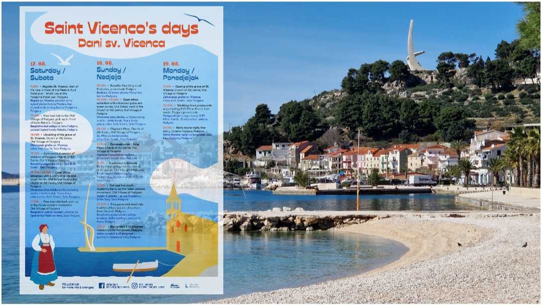 Tradicionalna proslava ove godine donosi trodnevni program Dani sv. Vicenca, koji će se odvijati od 17. do 19. kolovoza. Od sakralnih i svečanih trenutaka do sportskih nadmetanja, od zabavnih programa, folklora, sajma i derneka te velikog koncerta – imamo sve što vam treba za tri dana veselja. Pozivamo vas da pregledate program i da zajedno proslavimo ovu svetkovinu, a posebno centralni dan 18. kolovoza, kad slavimo dan našeg zaštitnike sv. Vicenca – pozivaju Općina Podgora i Turistička zajednica Općine Podgora.