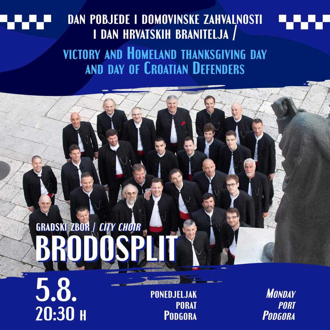Gradski zbor Brodosplit održat će svečani koncert povodom obilježavanja Dana pobjede i domovinske zahvalnosti te Dana hrvatskih branitelja. Koncert će se održati u ponedjeljak, 5. kolovoza, s početkom u 20:30 sati u Poratu u Podgori.