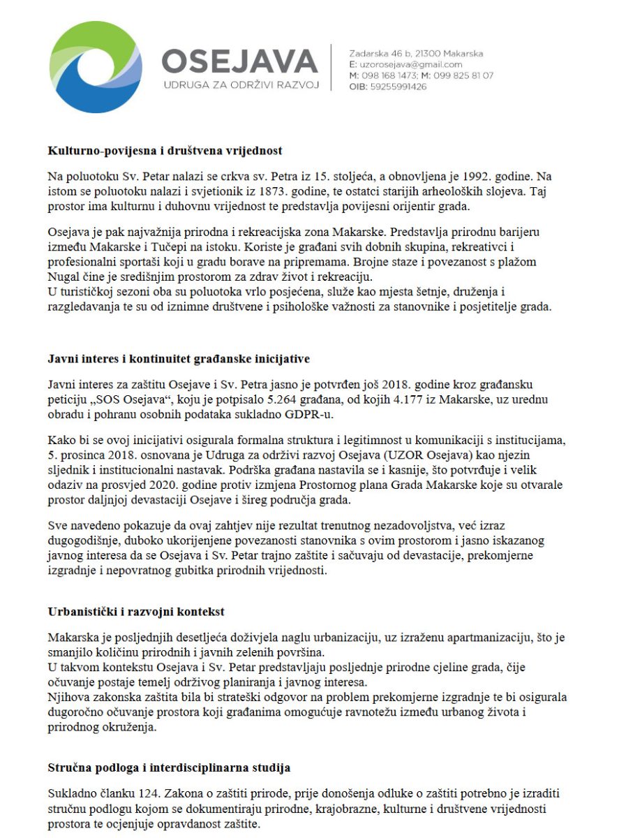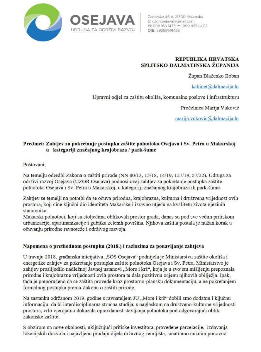 Udruga UZOR Osejava poslala je priopćenje u kojem ističu kako su ponovno podnijeli zahtjev za zaštitu makarskih poluotoka. Poručuju da se
