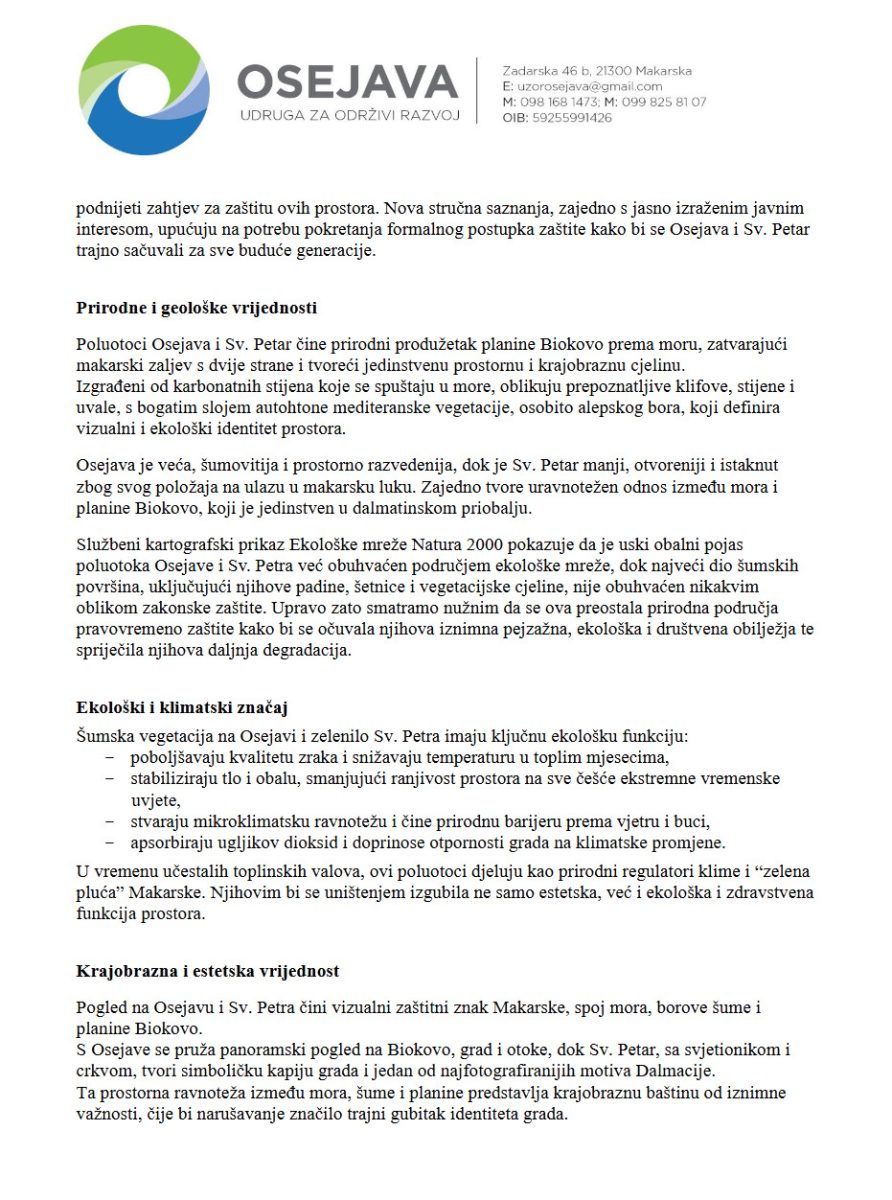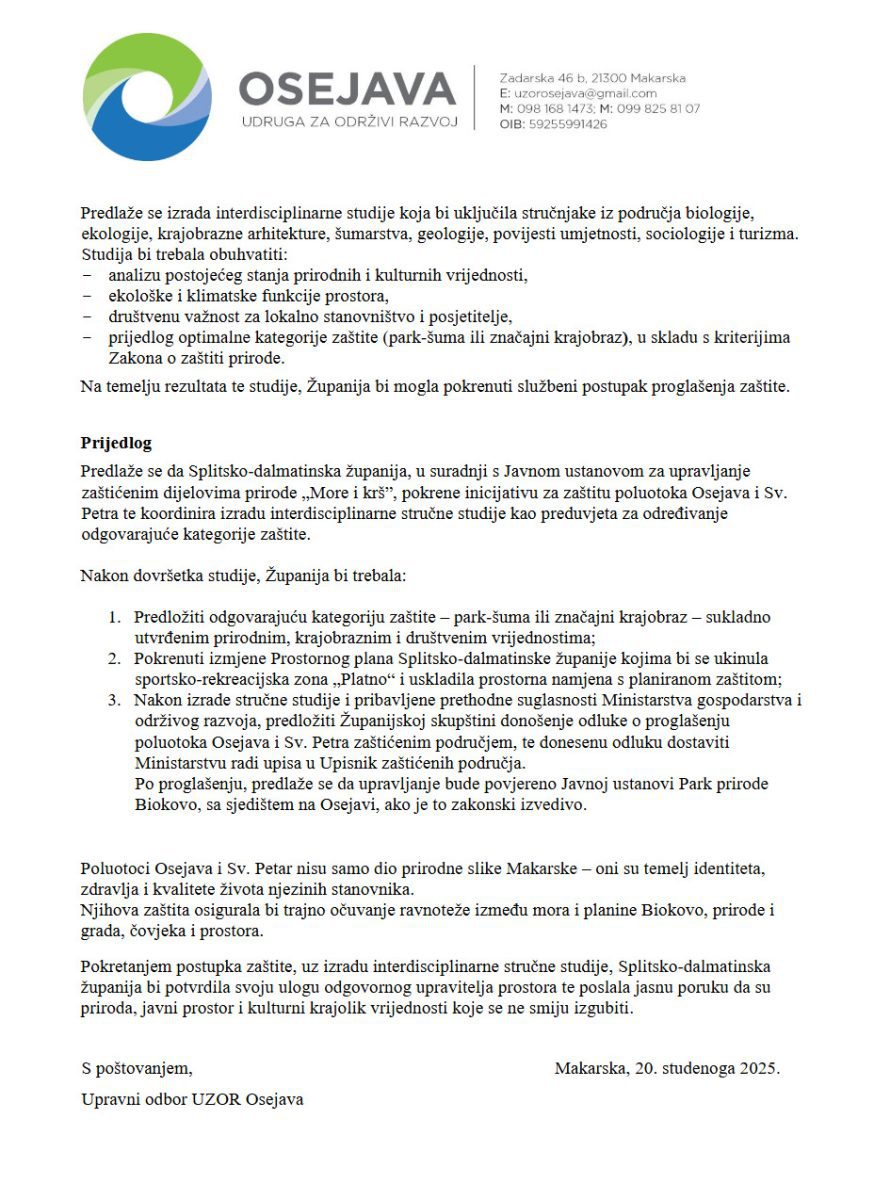 – Podsjećamo, još je 2018. godine građanska inicijativa “SOS Osejava” prikupila 5.264 potpisa, od čega 4.177 iz Makarske, tražeći da se poluotoci zaštite kao značajni krajobraz. Unatoč tada pozitivnim mišljenjima struke, postupak zaštite nije pokrenut, već je upućena preporuka da se sve riješi kroz prostorno-plansku dokumentaciju što se nije dogodilo, dok je pritisak na prostor kontinuirano rastao.