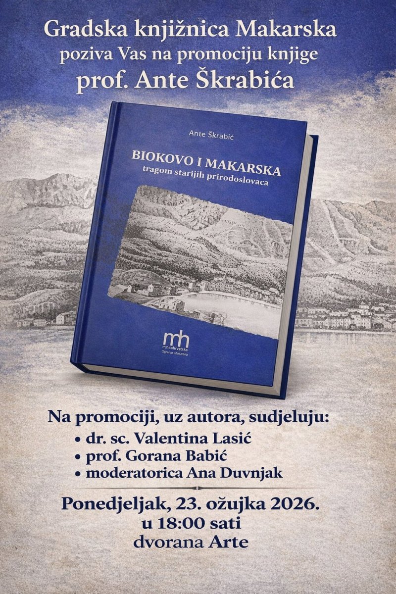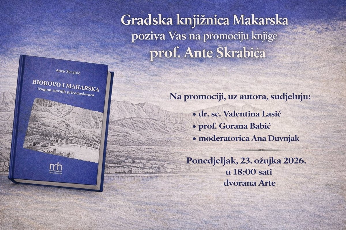 Gradska knjižnica poziva sve ljubitelje prirode, povijesti i dalmatinske baštine na predstavljanje knjige “Biokovo i Makarska: tragom starijih prirodoslovaca” profesora i proučavatelja zavičajne povijesti Ante Škrabića, koje će se održati u ponedjeljak, 23. ožujka 2026., u18:00 sati u dvorani Arte.