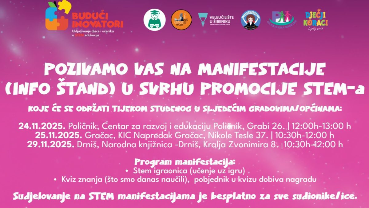 U studenom 2025. u okviru projekta planiramo organiziranje 3 manifestacije u svrhu promocije STEM-a u Poličniku, Gračacu i drnišu. Sudjelovanje na manifestacijama je besplatno i otvoreno za svu djecu vrtićke dobi te učenike od prvog do četvrtog razreda osnovne škole.