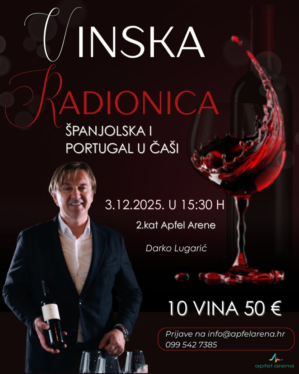 Iz Apfel Arene pozivaju na vinsku radionicu s Darkom Lugarićem Španjolska & Portugal u čaši, koja će se održati u srijedu 3. prosinca.